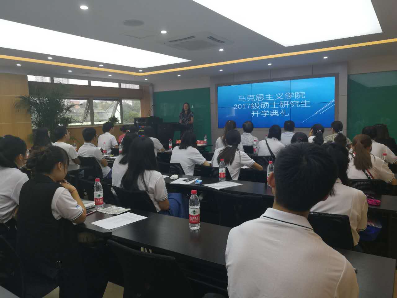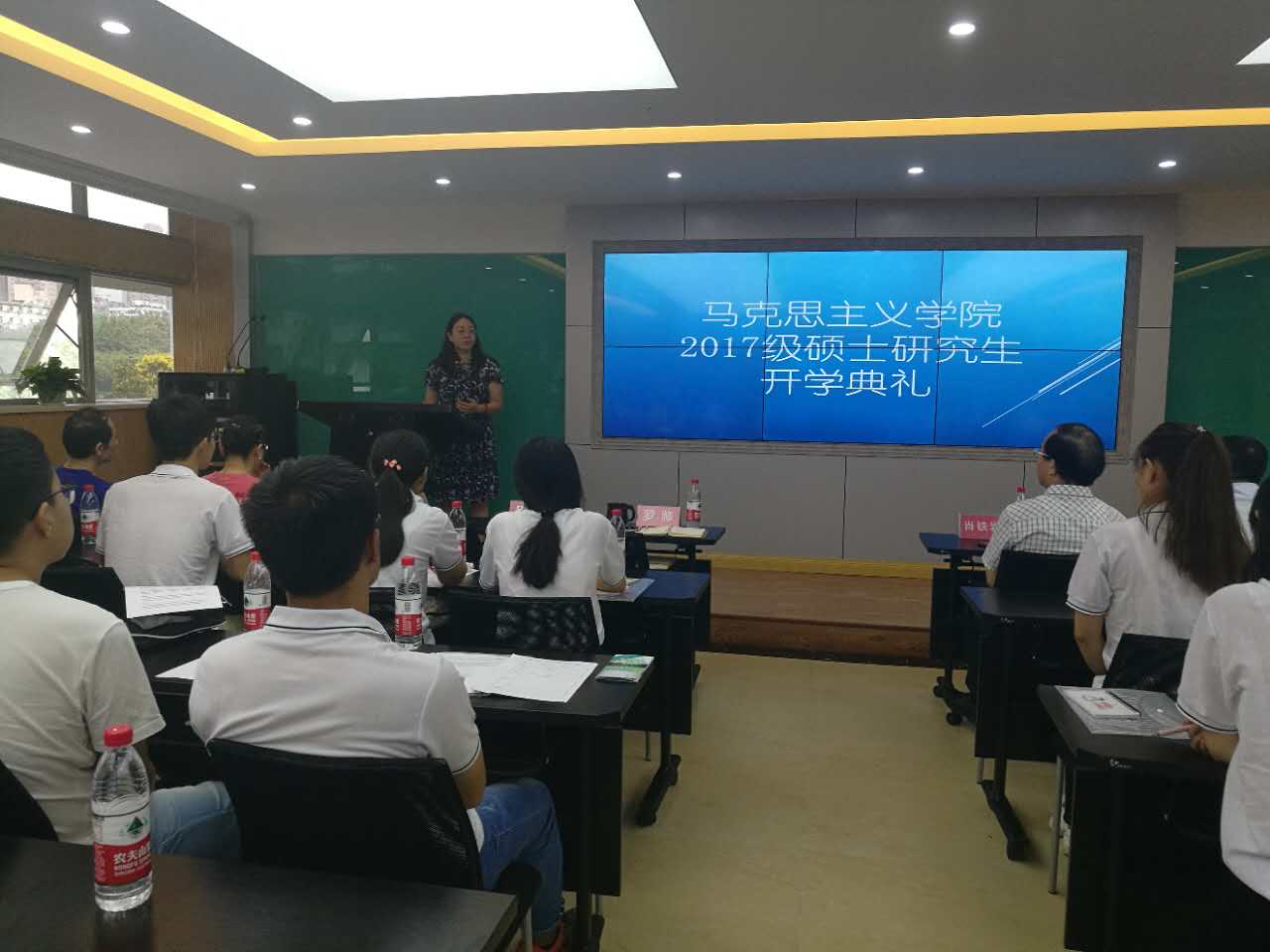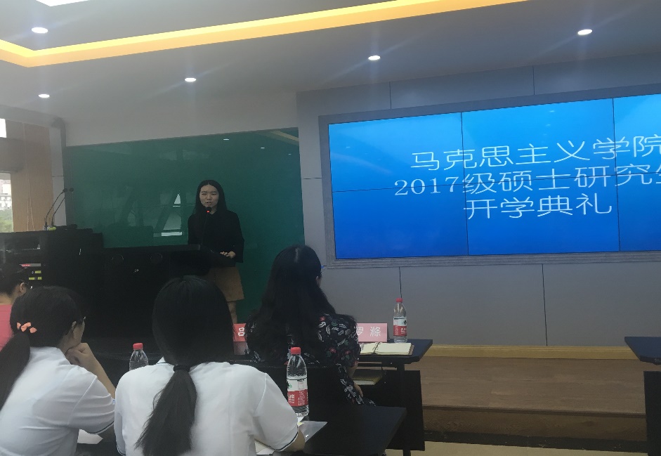 研究生三年级王珂同学作为高年级同学代表首先发言。她表达了对于新生的欢迎,告诉同学们要有梦想,要努力学习知识,要有发现、质疑和创造之心,并引用毛主席的话语教导同学们,一刻也不能停止对问题的思考。2017级新生代表江尧随后发言,表达了对于各位老师的感激之情,讲述了自己考研以来的心路历程,表示一定要踏实做事,学会正确做人。