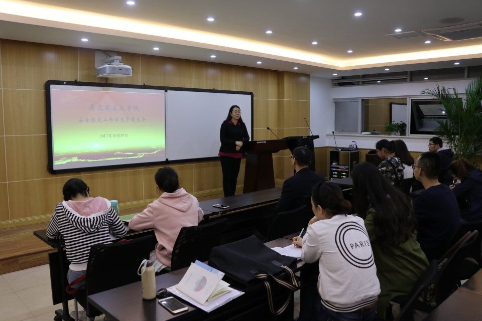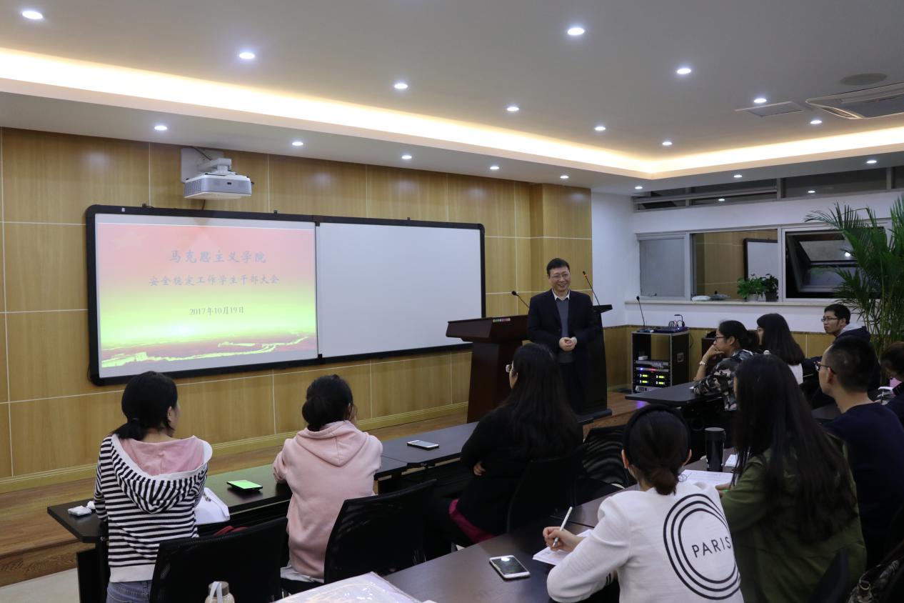 罗滌首先讲话,她说,时值十九大召开期间,各部门应紧抓安全工作不放松,她请学生干部一定要密切关注同学们存在的主要问题。她要求老师和学生干部一定要密切关注学生的动态,学生离校一定要到辅导员和导师处报备,得到许可方可外出。同时她要求学生干部要多关注特殊群体,对在经济、学习、生活或心理方面有困难的同学要给予帮助,要主动关注在外租房同学的安全问题。学生干部要发挥好自身作用,做到群策群力,有问题首先要与老师积极沟通,切实做好同学们安全教育工作。
