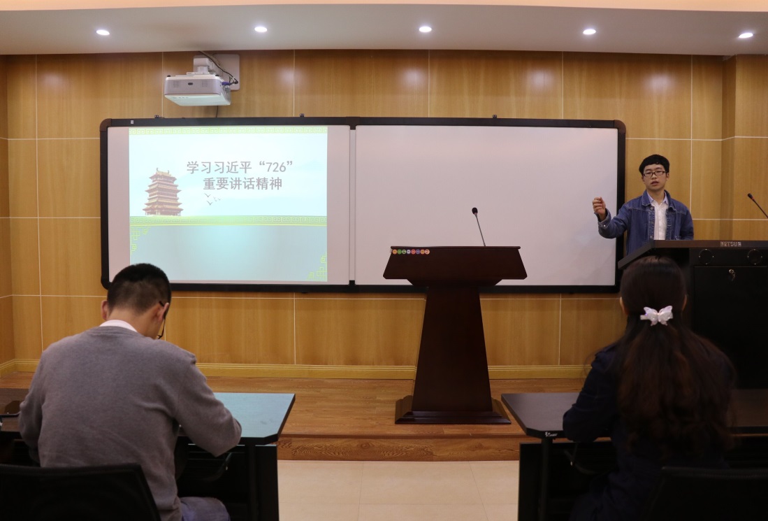 马尚明同学代表第四小组,以“习近平总书记的群团工作思想”为主题,汇报了群团工作的内涵和原则、群团工作的地位和作用以及群团改革工作的要求和措施。汇报末,马尚明引用习近平总书记话语“只有把人生理想融入国家和民族的事业中,才能最终成就一番事业”与同学们互勉。